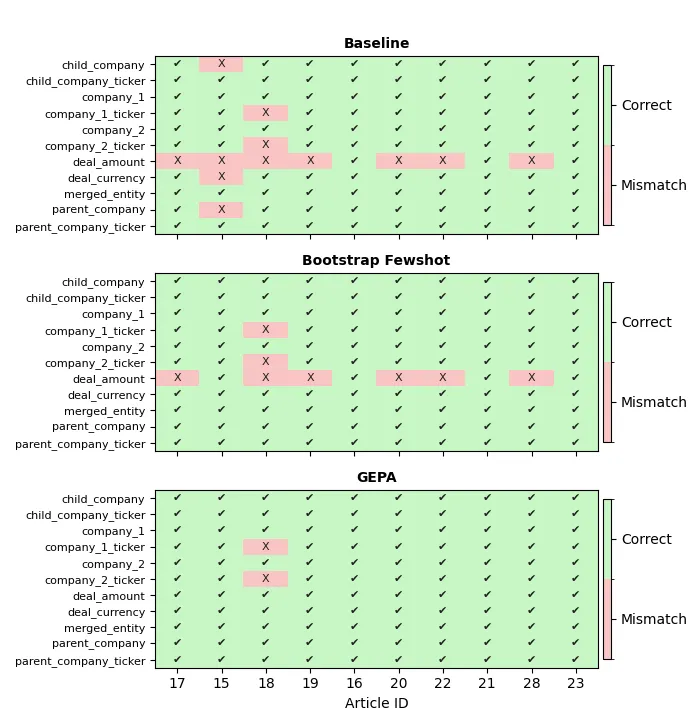 In this post, we looked at two optimizers in DSPy — bootstrap fewshot and GEPA — and showed how they can be used to improve the performance of an M&A information extraction pipeline from an initial baseline score of 80.7%, to 90% and then 97.8% with a light GEPA run. With heavier GEPA runs, it should be possible to get even closer to 100%.