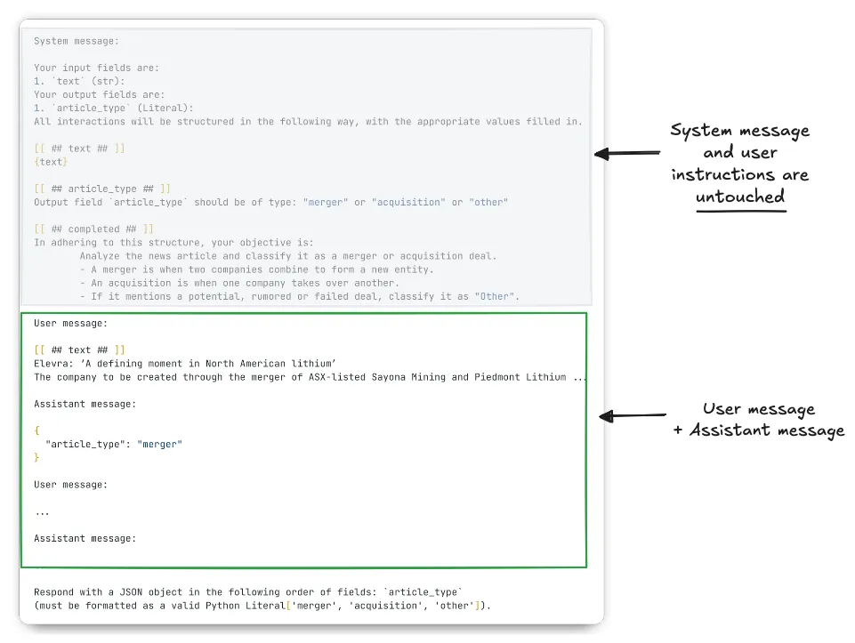 Fewshot examples: The optimizer can add, remove or modify fewshot examples from which the model can learn during inference time. This is the easiest and cheapest way to optimize a DSPy program. When adding fewshot examples, the optimizer leaves the entire prompt unchanged — it simply adds demos to the “assistant message” section of the prompt (shown later in this post).